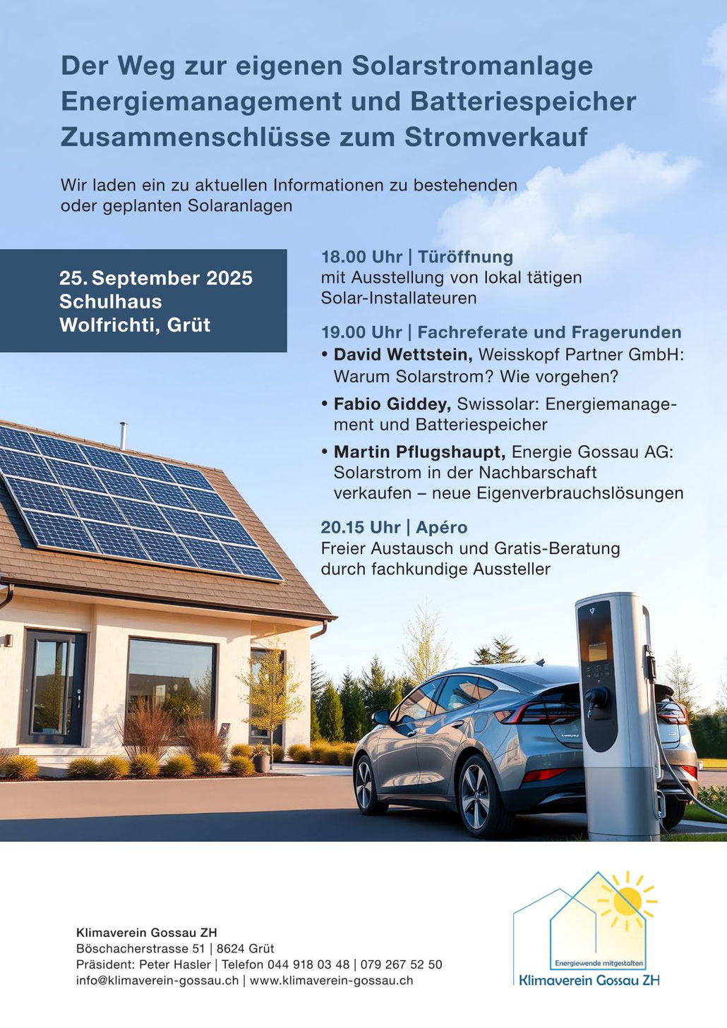 Der Klimaverein Gossau organisiert am 25. September 2025 eine Informationsveranstaltung für alle, die eine Solarstrom-Anlage planen oder bereits realisiert haben. Die Zahl der Photovoltaikanlagen in der Schweiz steigt kontinuierlich. Im Jahr 2024 lieferte der Solarstrom erstmals über 10% des Schweizer Stromverbrauchs. Diese Menge muss sich aber noch vervierfachen, um die Ziele der Schweiz zu erreichen.